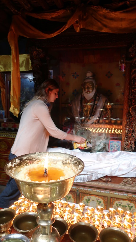 Our group was welcomed by the local commitee and the keepers of the temple under the turquoise roof and were invited to have a seat inside. Under the curious eyes of a whole bunch of local children and villagers we lighted a hundred Butter lamps in front of the altar and performed a long Puja-ritual lead by our teacher Dr. Nida. The recitation of certain mantras dedicated to Yuthok himself as well as drinking sweet-sour chang (=barley wine) were part of this ceremonie which aimed to empower our healing abilities for the benefit of all beings.
